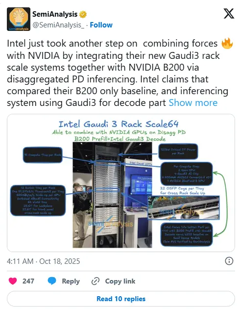 در این ساختار هیبریدی، تراشههای Gaudi 3 وظیفه پردازش بخش «Decode» در فرایندهای استنتاج (Inference) را بر عهده دارند، در حالیکه تراشههای Blackwell B200 مراحل پیچیدهتر و سنگینتر «Prefill» را اجرا میکنند. این تقسیم وظایف بر پایه شناخت دقیق تواناییهای هر دو تراشه انجام شده است. تراشههای Blackwell برای عملیات ماتریسی عظیم طراحی شدهاند، در حالی که Gaudi با تمرکز بر پهنای باند حافظه و شبکهسازی اترنتی، بهینهترین کارایی را در پردازشهای توزیعشده ارائه میدهد.